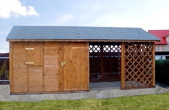 6x3m, připojen ke garáži pro auto (velikost: 3x3m), uzamykatelná místnost pro nástroje (velikost:. 1,5 x 3 m) a větraný přístřešek na dřevo (velikost:. 1,5 x 3 m), krytý sedlovou střechou se šindelem, vše impregnováno "Drewnochronem".
