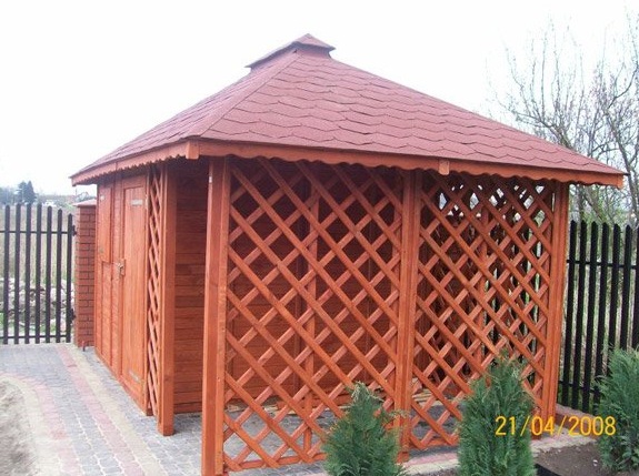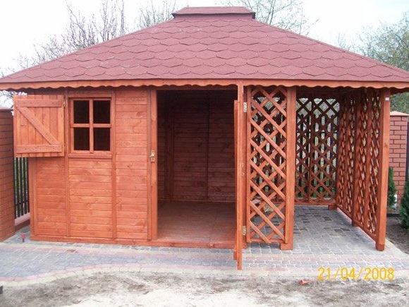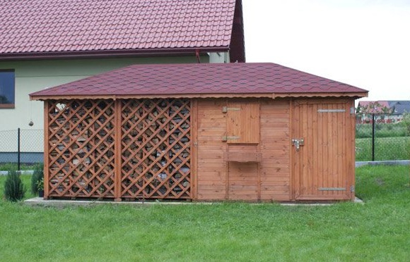 Dřevník "Mroczek" 3x4,5 m se sedlovou střechou. Stěny obložené 3x3m palubkami. Část pro ukládání nástrojů, prolamovaná 1,5 x 3m slouží jako dřevník. Konstrukce umožňuje zákazníkovi dodělat zateplení.
