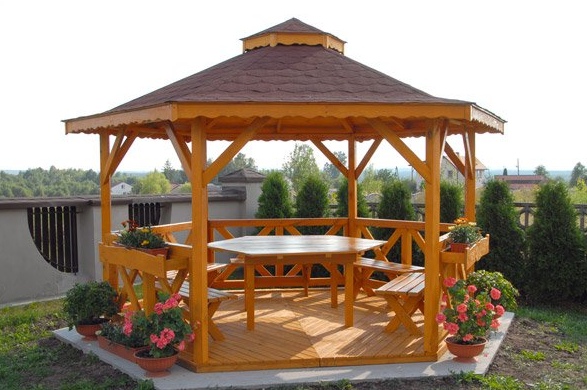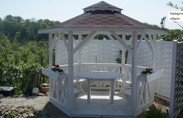 Hexagonový trn z borovice, lakovaný, krytý šindelem. Vybavení: podlaha, stolní a nosné sloupy, přesah 9x9 cm. Sloup výška 2 m, výška 2.70 m.