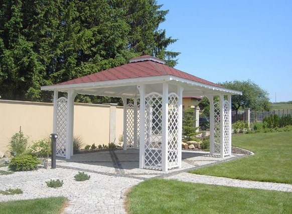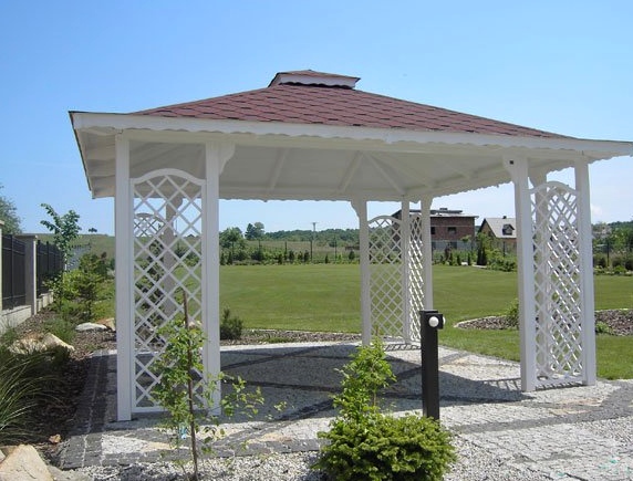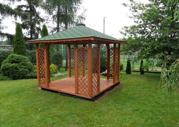 Altán z borovice, čtverec o rozměrech 3 x 3 m, impregnováno, asfaltové šindele potažené v Burgundsku, hnědá, zelená, dřevěné uhlí a černá. Bílá barva za příplatek.